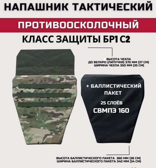 В напашник входит баллистический пакет, который создаёт дополнительную защиту от пуль пистолета и различных осколков.